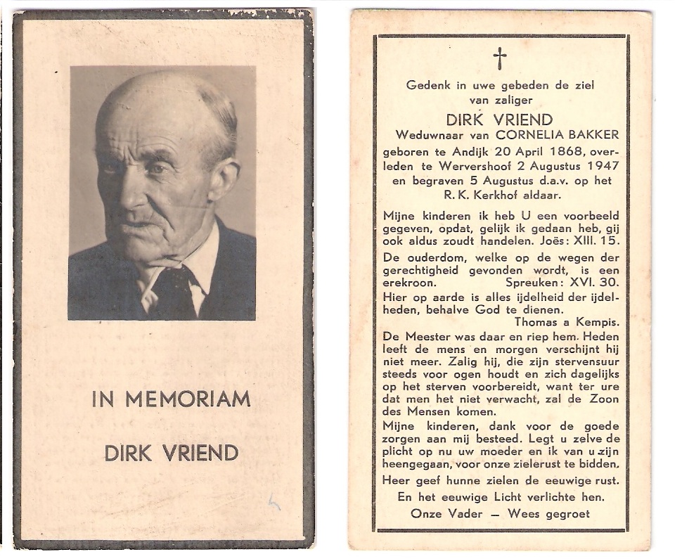 4b3b  Dirk Vriend, Landbouwer, geboren 20 april 1868 in Wervershoof, overleden 2 augustus 1947 in Andijk getrouwd op 24 april 1895 in Andijk met Cornelia Bakker, geboren 15 september 1872 in Grootebroek, overleden 24 maart 1945 in Wervershoof, dochter van Dirk bakker en Petronella Cornelia Busker.